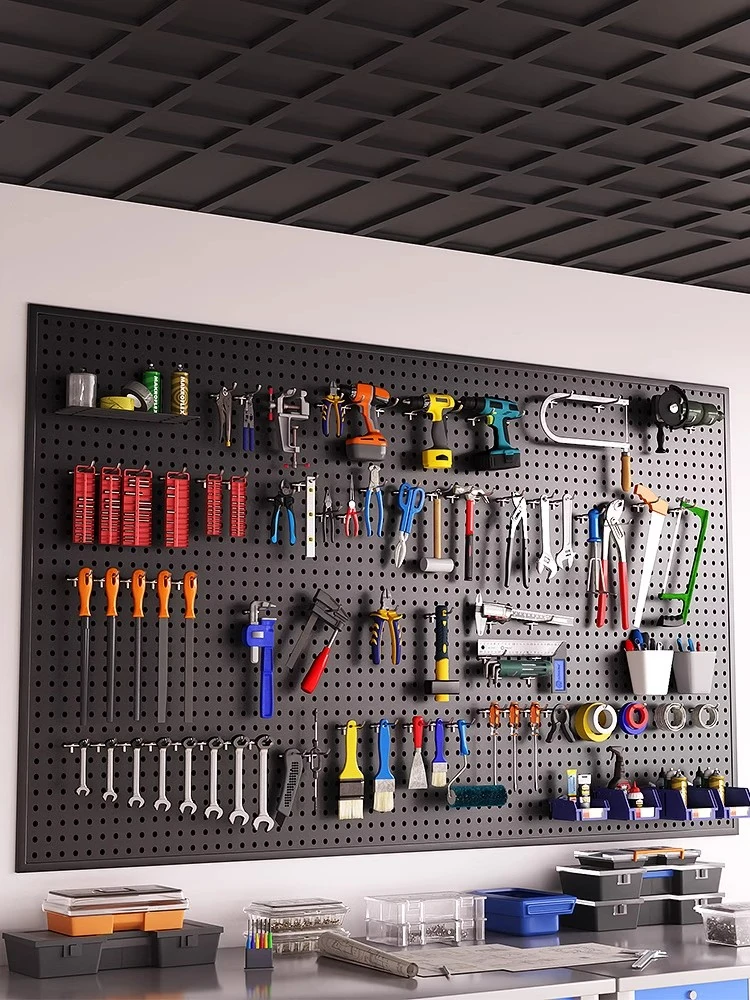 三夢eスポーツルームの便利な壁掛け収納!耐久性のあるアイアン製・ステンレス穴あきボードで、整理整頓が簡単。コンピュータデスクやゲーム機の収納に最適なアイテムです。