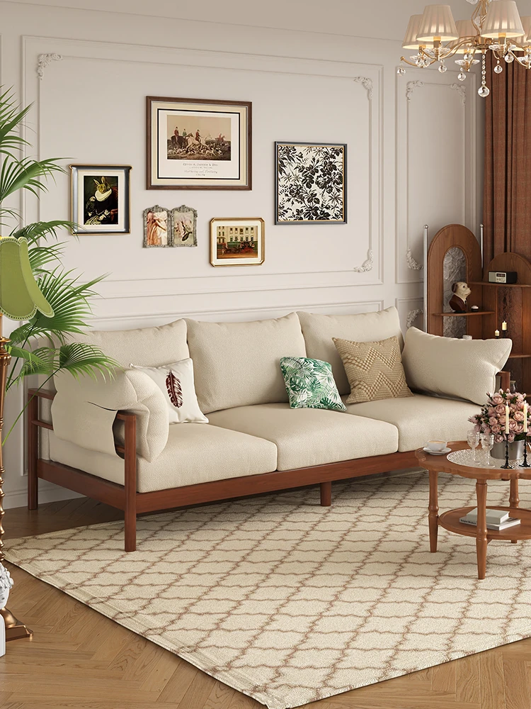 Elegant French Vintage Solid Wood Sofa for Cozy Apartments - Creamy Fabric Loveseat Perfect for Living Rooms and Airbnb Stays, Stylish and Space-Saving Design