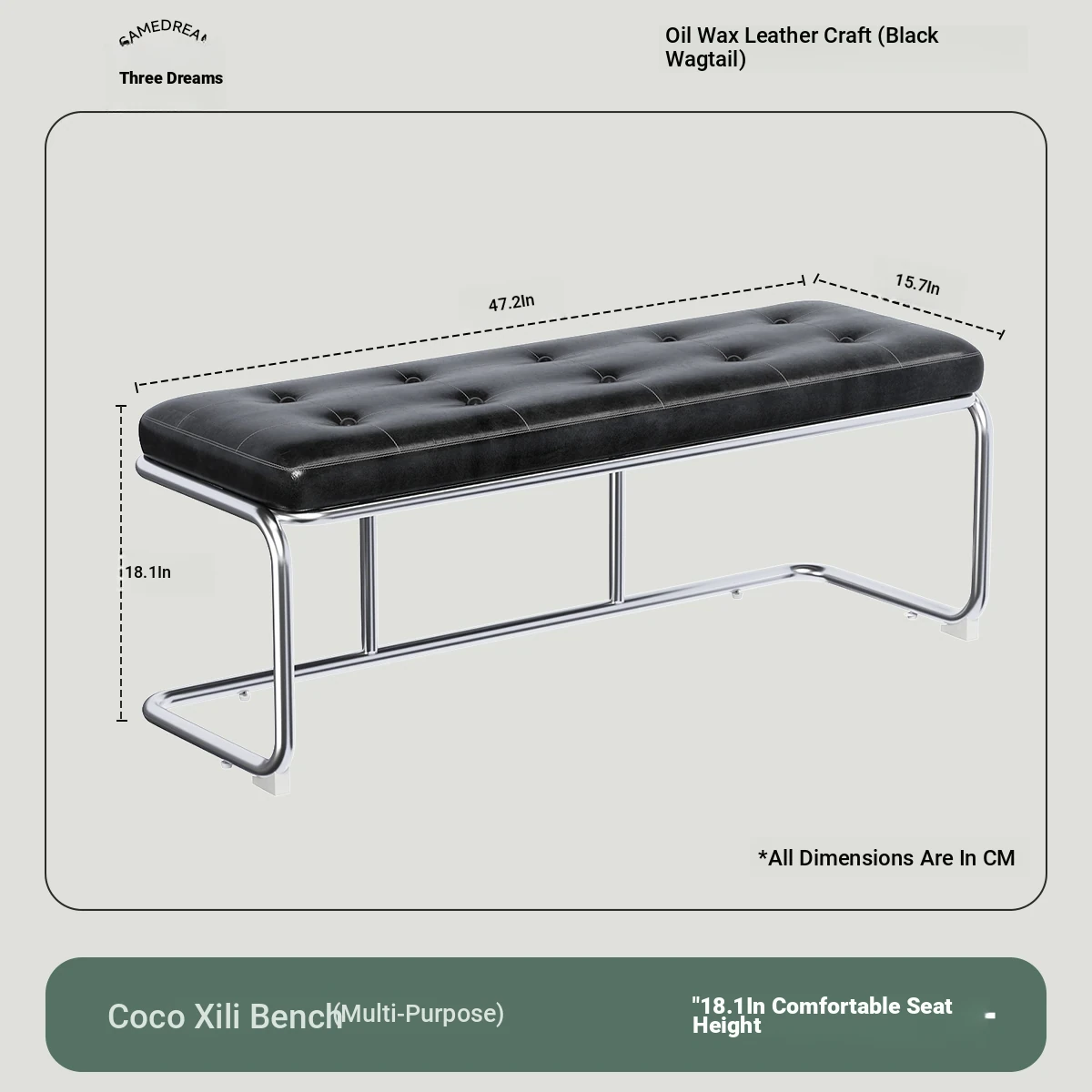 [Bench -47.24in] Magpie Feather Black, Oil Wax Craft Leather