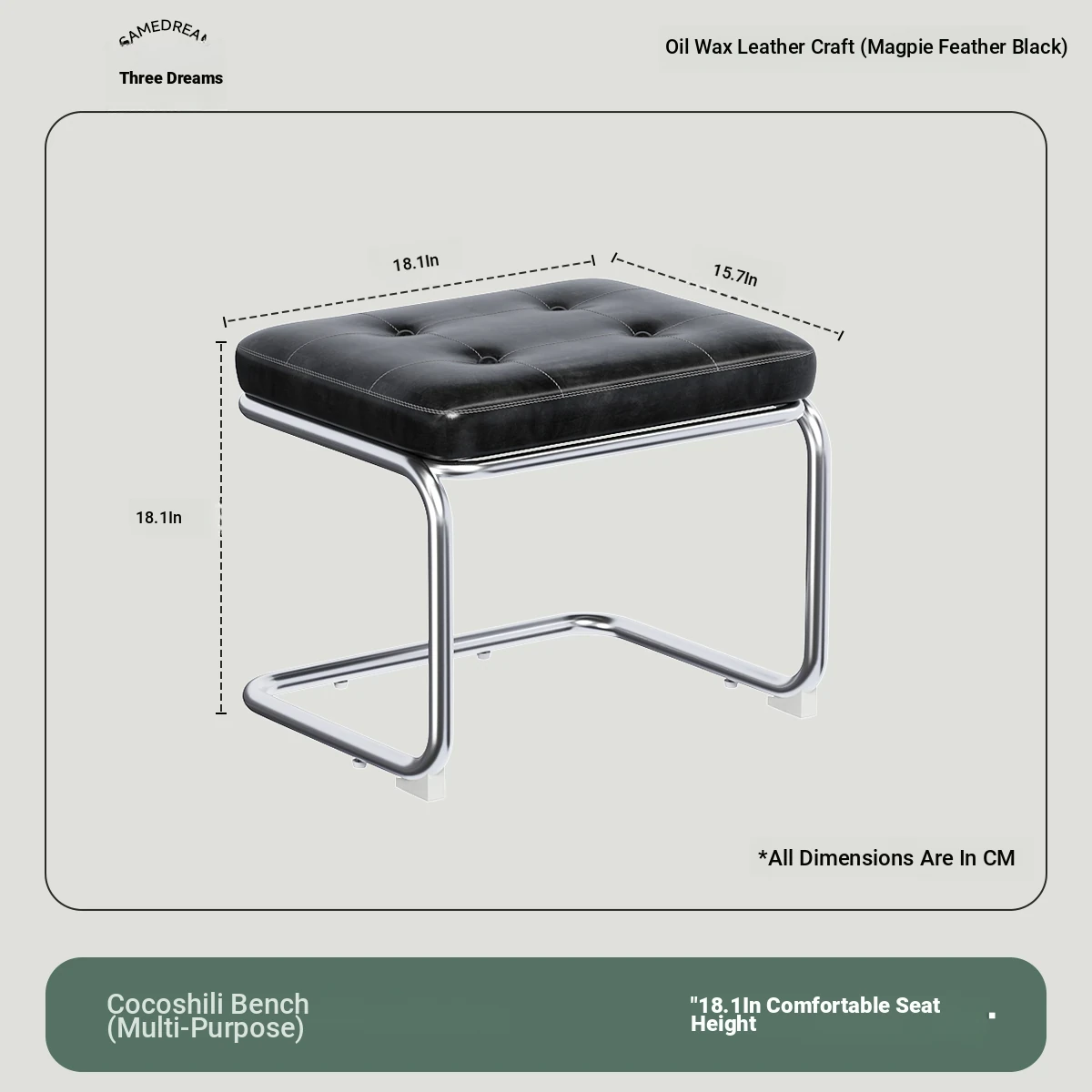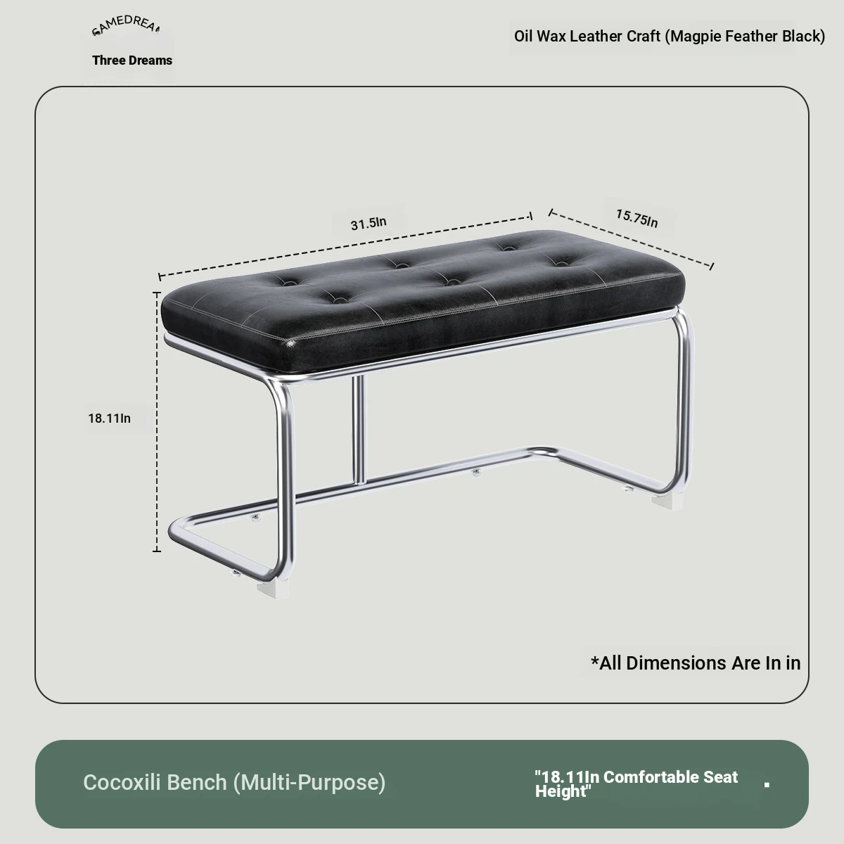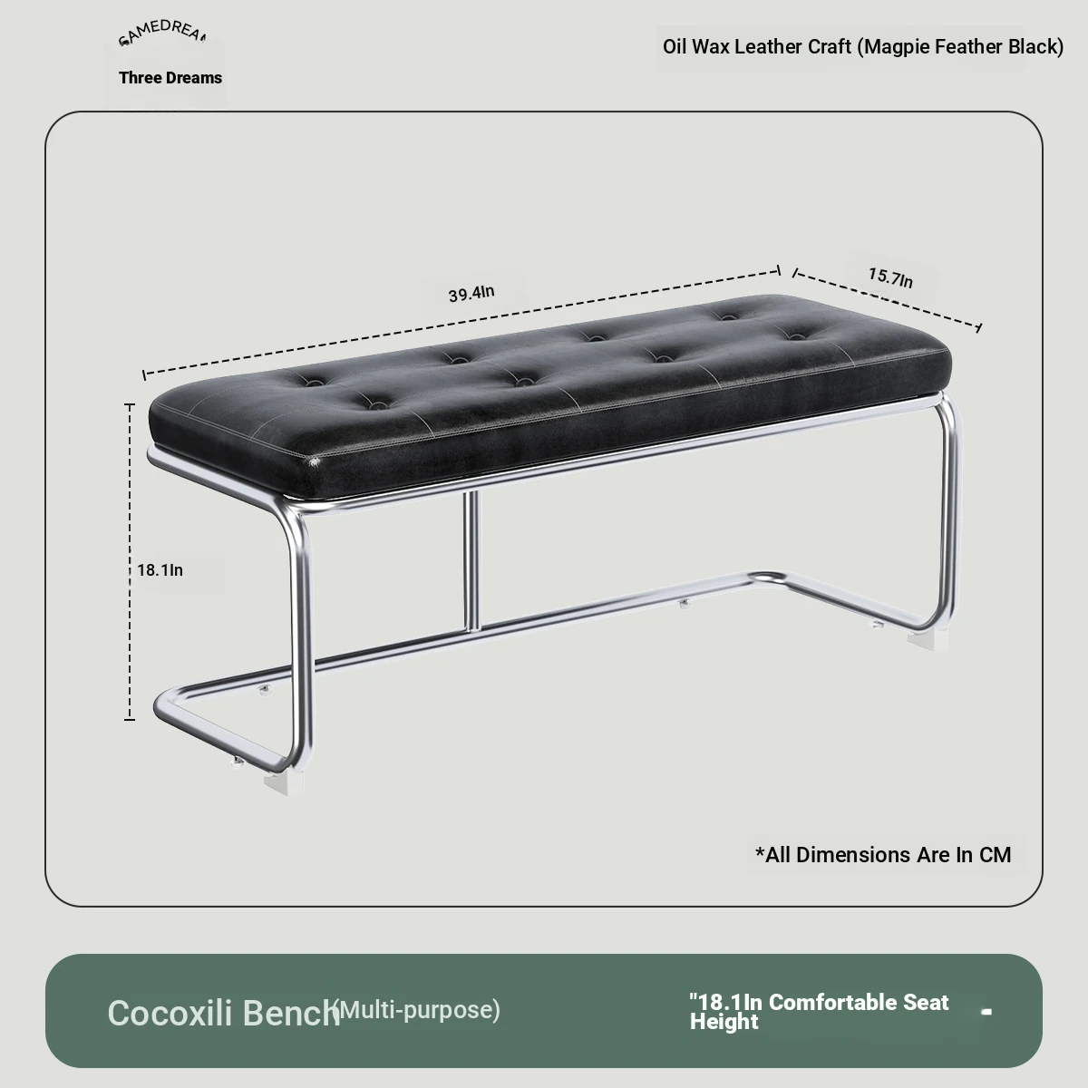[Bench -39.37in] Magpie Feather Black, Oil Wax Craft Leather