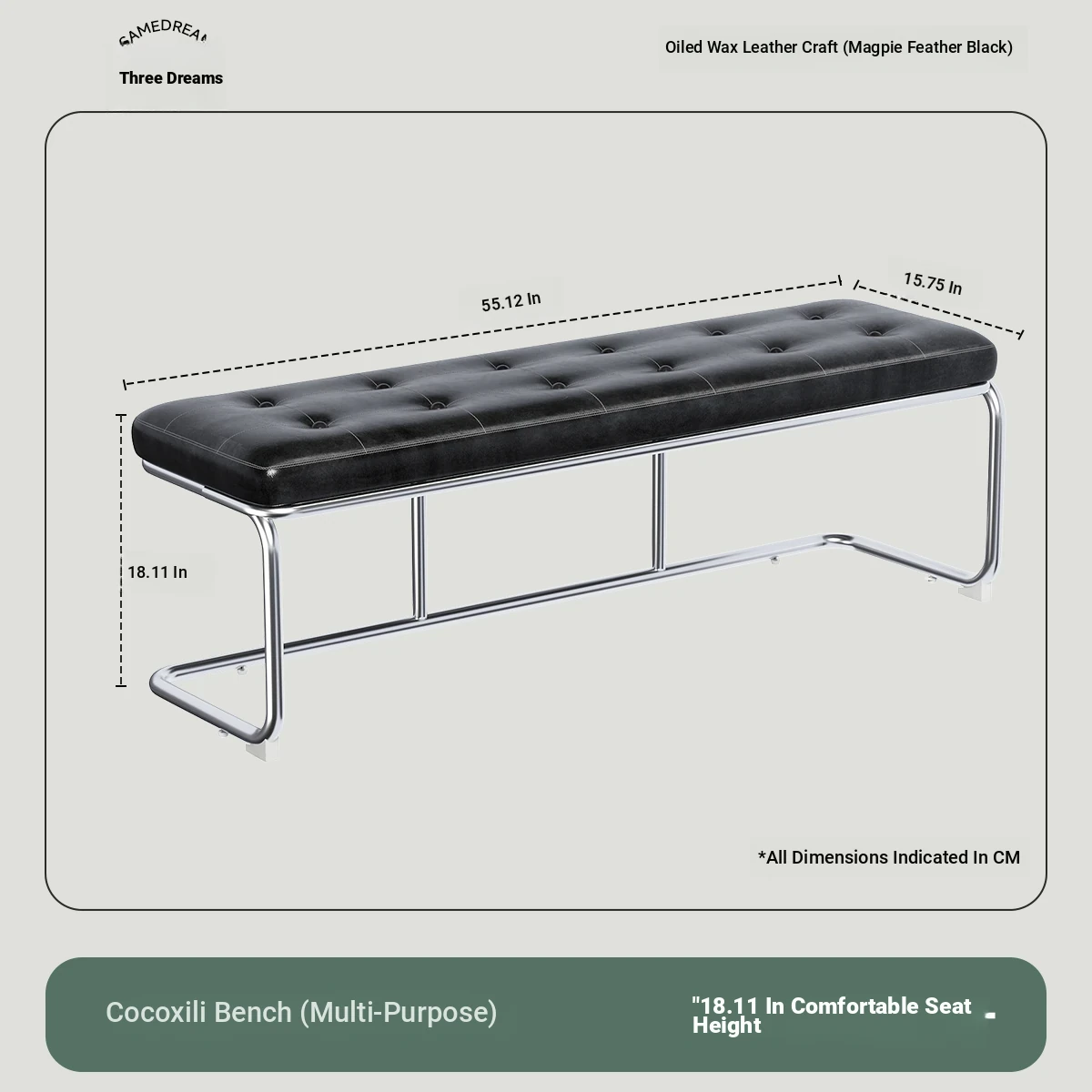 [Bench -55.12in] Magpie Feather Black, Oil Wax Craft Leather
